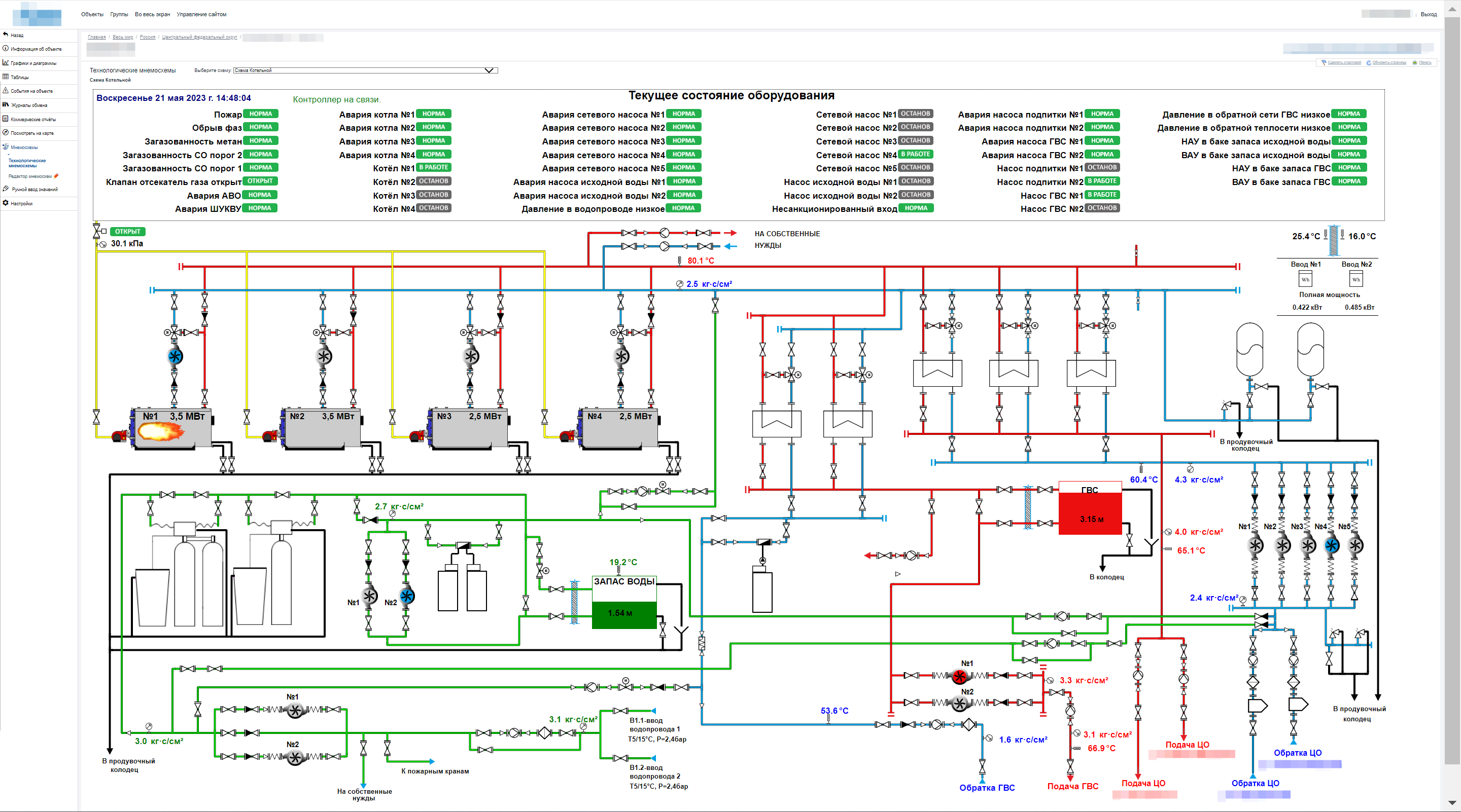 Система собирает информацию от приборов, контроллеров и других систем, включая текущие и архивные значения, а также настроечные параметры